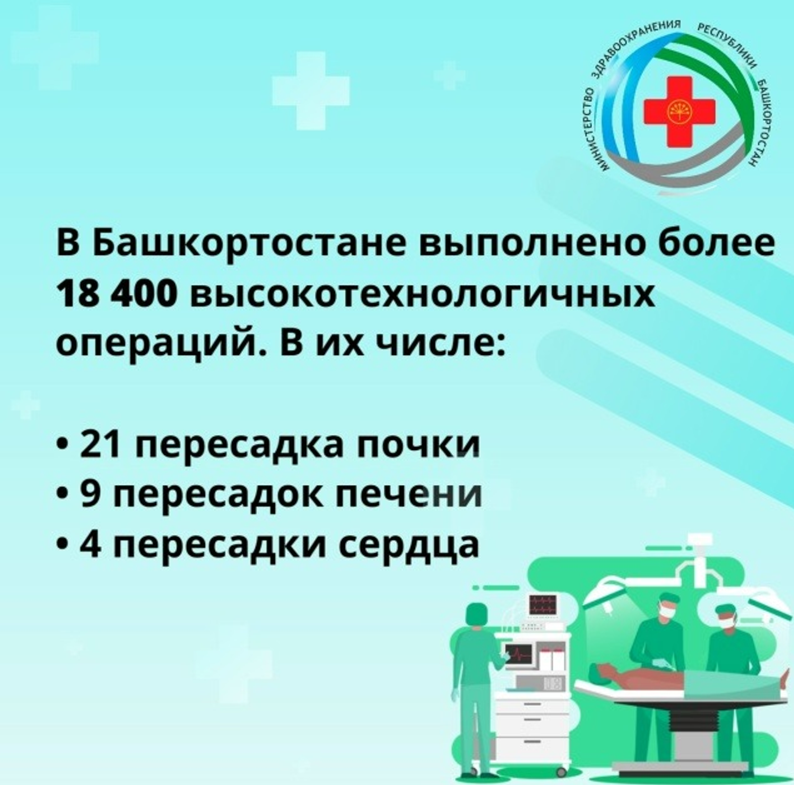 В Башкортостане успешно проводят высокотехнологичные медицинские вмешательства. С начала года выполнено более 18 400 операций, среди которых 34 - по трансплантации органов.
